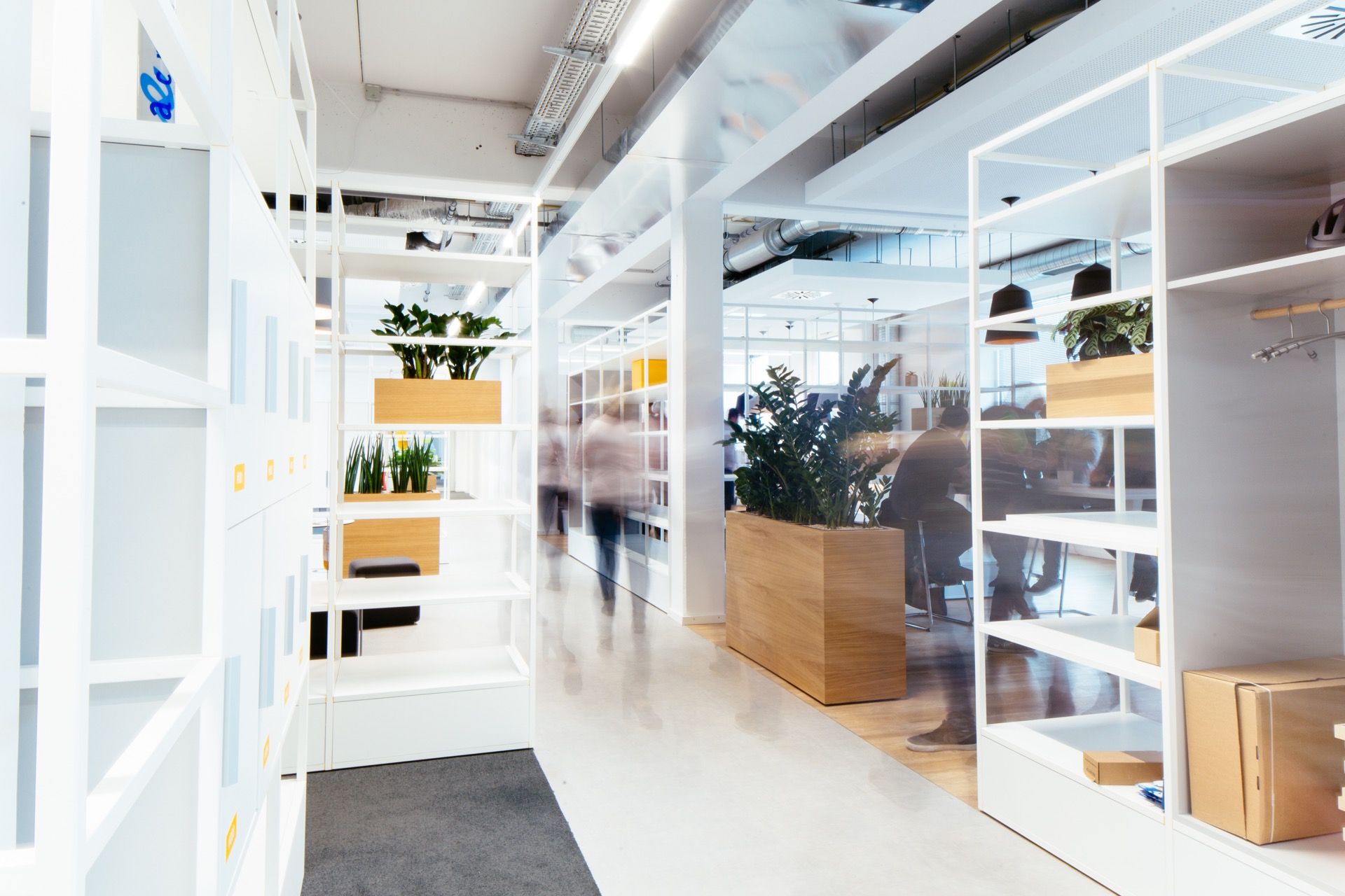 Grundbaustein des neuen LHIND Workspaces ist ein Raumteilersystem genannt Supergrid. Als Basis dient eine 2,35m hohe weiße Gitterstruktur die diverse Elemente wie Whiteboards, Sitzwürfel, Monitore oder einen Kühlschrank aufnehmen kann. Die Mitarbeitenden können das Supergrid mithilfe eines einfachen Inbusschlüssels unkompliziert selbst konfigurieren; dabei entstehen eine Vielzahl von Fächern und Flächen, die explizit zum Gestalten, Hinstellen und Aufhängen einladen. Und damit entsteht Raum für Individualität von Einzelnen oder Teams. Gleichzeitig schluckt das Supergrid Schall und gibt den Teams ein genügend starkes Gefühl der Einheit. Die Sicht bleibt luftig, die Wege innerhalb und zwischen Teams werden kürzer und der Platzbedarf sinkt.